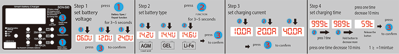 Flexible charging current setting depsnds on the capacity of Battery...etc.